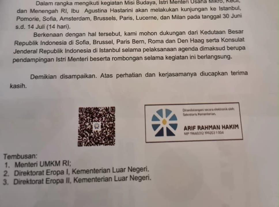 "Berkenaan dengan hal tersebut, kami mohon dukungan dari Kedutaan Besar Republik Indonesia di Sofia, Brussel, Paris, Bern, Roma, dan Den Haag serta Konsulat Jenderal Republik Indonesia di Istanbul selama pelaksanaan agenda dimaksud berupa pendampingan istri menteri beserta rombongan selama kegiatan ini berlangsung," bunyi surat tersebut.